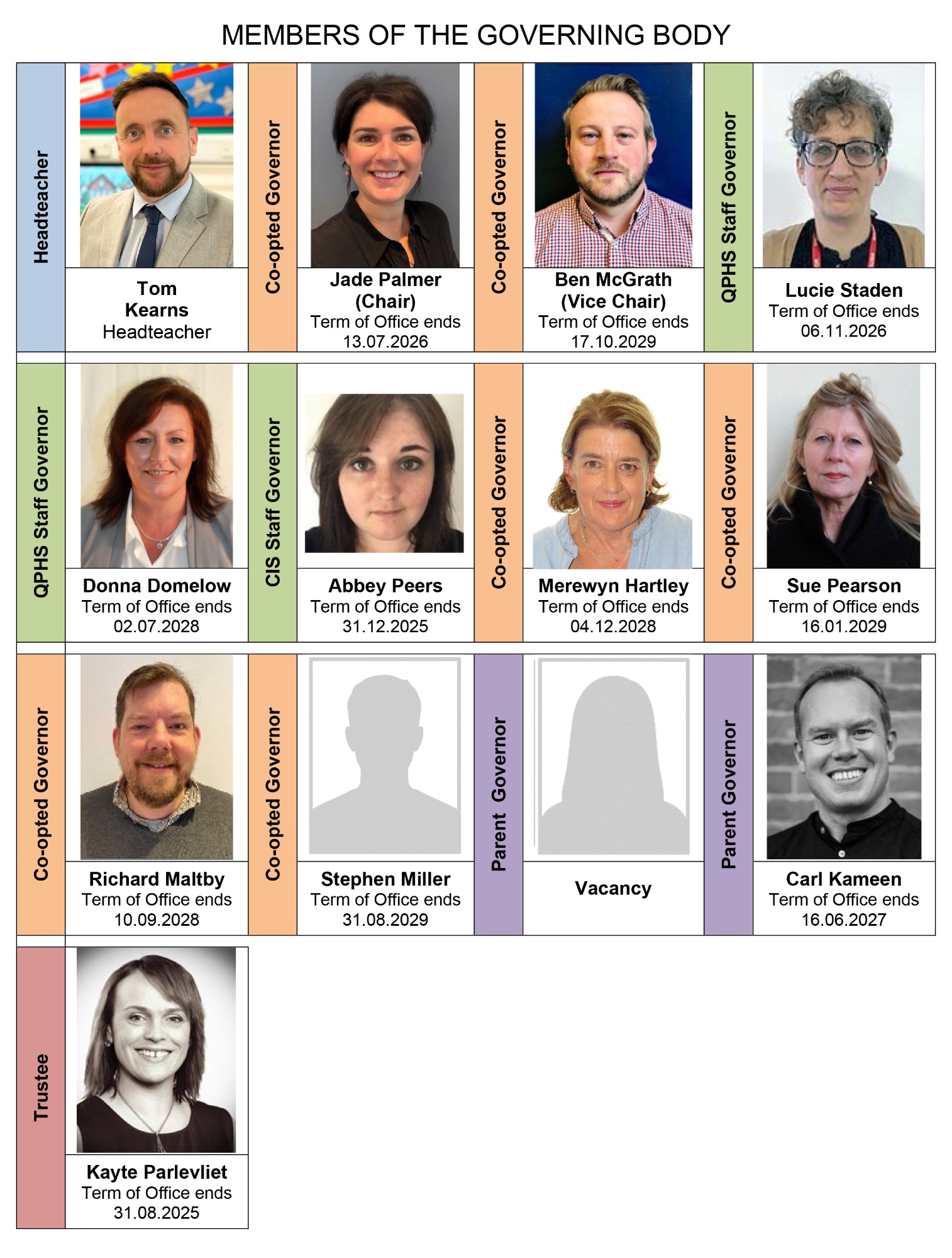 • Staff Governors are either teachers or support staff at the school and are elected by their colleagues (QPHS/CIS staff)
