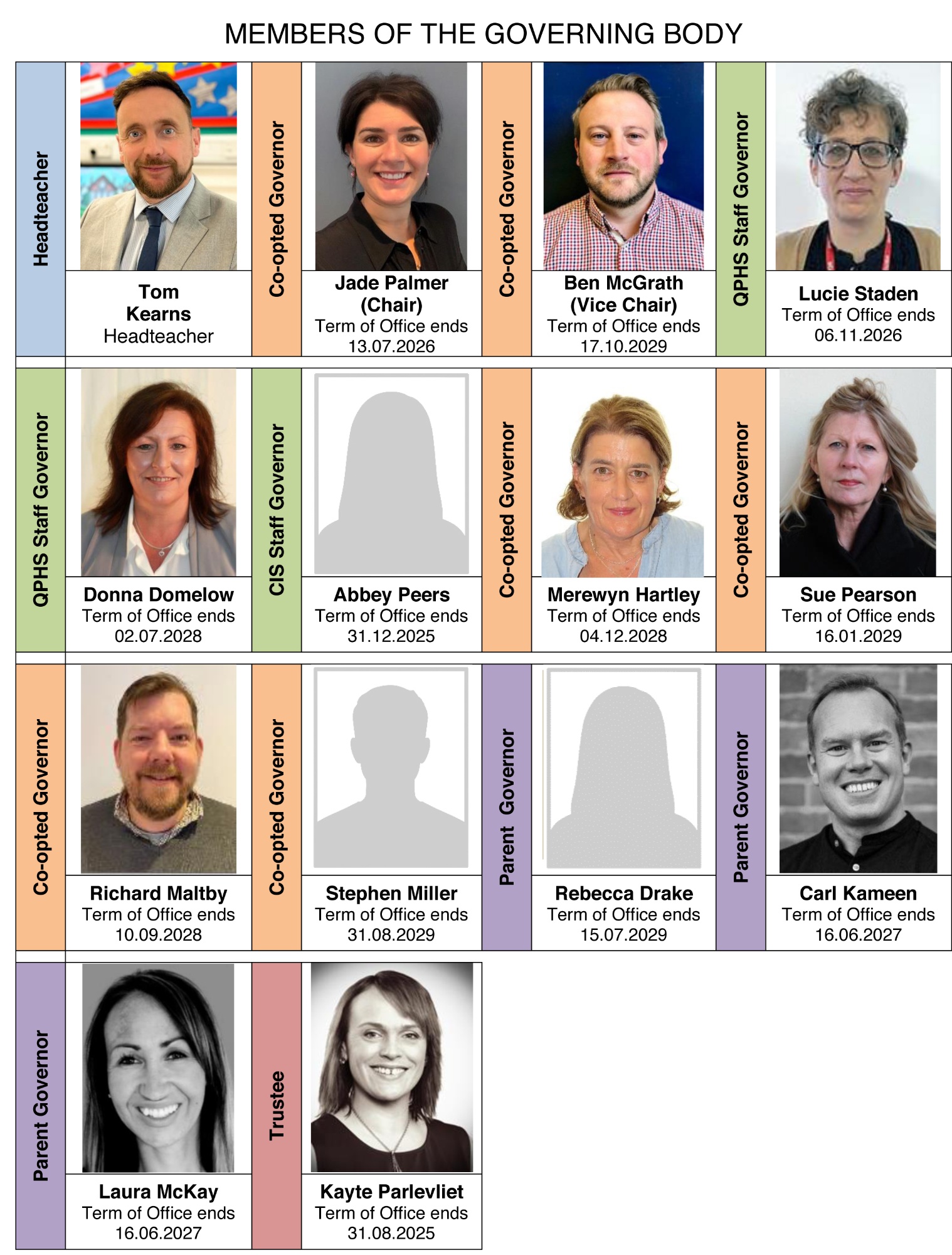- Staff Governors are either teachers or support staff at the school and are elected by their colleagues (QPHS/CIS staff)
